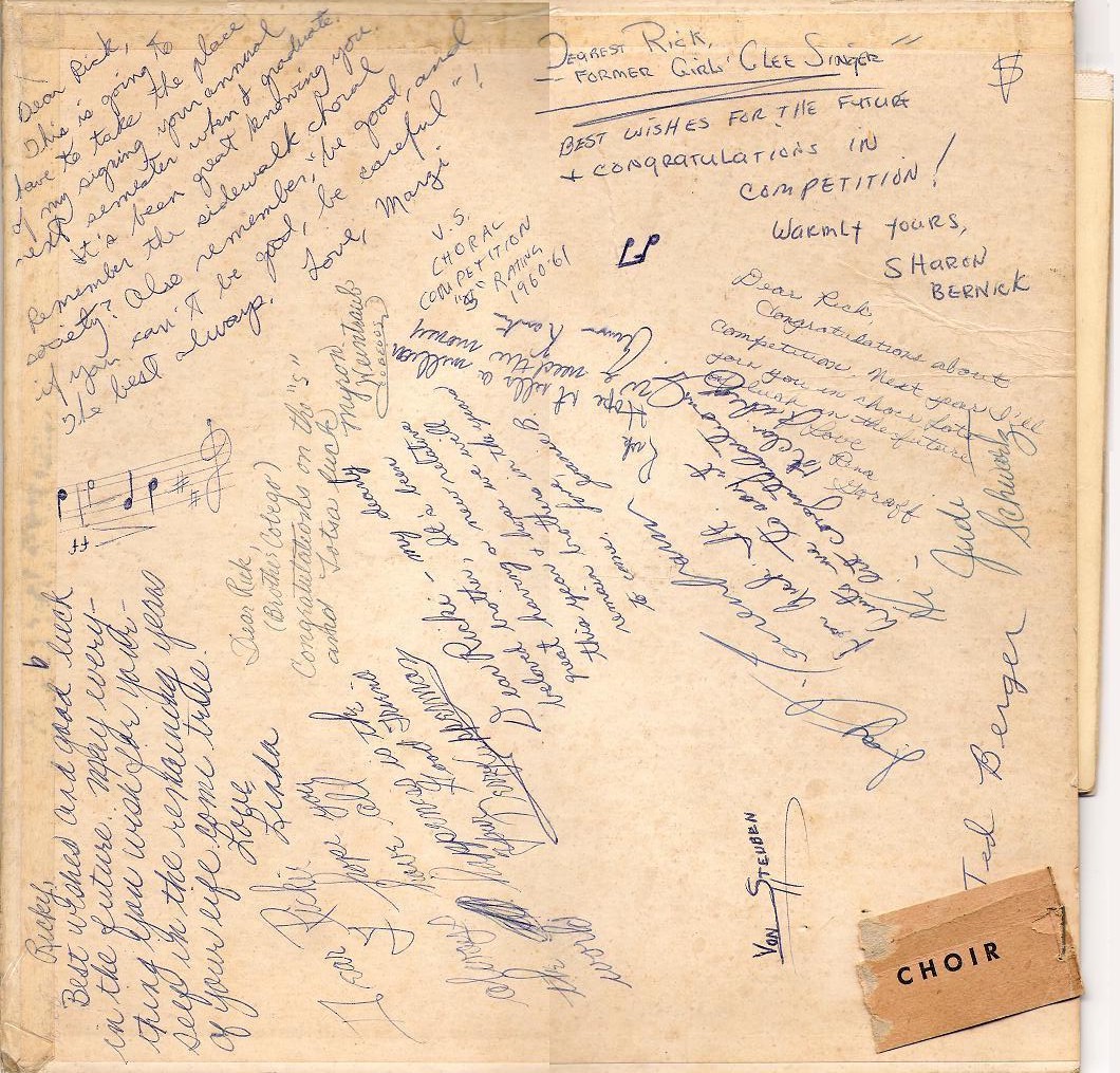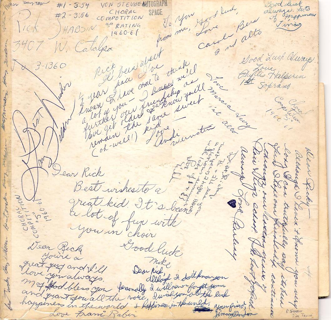 The album cover for the 1960-61 recording is covered with autographs and comments by many of my fellow choir members, including: