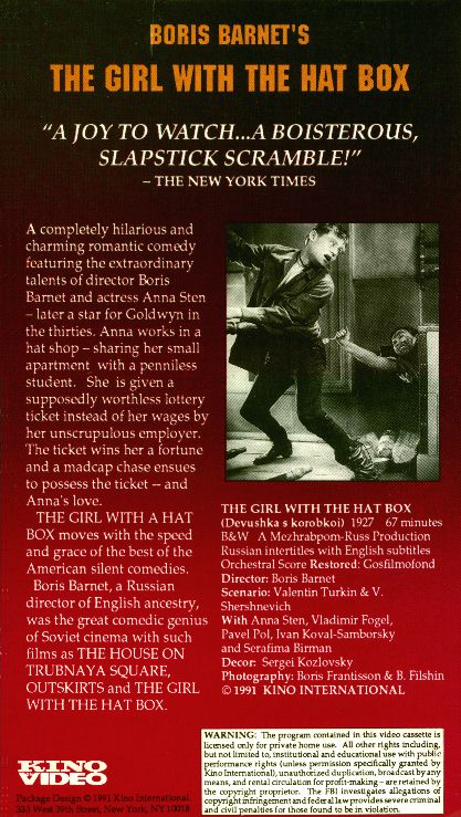 ![]() My Aunt, Yeva MilyutinaЕва Милютина For many years I had known that one of my mother's sisters, Yeva, was once an actress in Russia. My mother and her siblings (one brother Abe, and six sisters; Yeva, Reva, Rachel, twins Luba and Lola, and Anna), at one point in their youth, spent some time in Russia (Odessa, Ukraine), and while my mom came to the U.S. when she was around 15 years old (she arrived in the U.S. on December 24, 1930, maybe along with her other sisters), Yeva, the oldest of the sisters, stayed behind. I don't know much more about the story of my mom's family's early migration around Europenote, but during a conversation with my cousin Gloria, the topic of our movie star aunt came up. Gloria knew our Aunt Yeva's Russian last name (it turned out, it wasn't the same as my mother's American maiden name), so I decided to start from there to see if I could find out more about her. I figured the Internet Movie Database would be a good place to start, and, sure enough, I found a not very detailed entry for Yeva Milyutina there. I wasn't able to track down any videos of her movies on the Internet, so I did a Google search for department of russian film. After picking out a few names from the search results and sending off a few quick e-mails, I got a reply from Professor Vance Kepley, Jr., the Chair of the Department of Communication Arts at the University of Wisconsin in Madison who recommended I try Facets Multimedia in Chicago where he thought I might be able to obtain a copy of The Girl With the Hat Boxnote (in Russian, Девушка с Коробкой), one of Yeva's few movies. Sure enough (and quite surprisingly!), Facets Multimedia had a copy of The Girl With the Hat Box on video. I ordered it and within a few weeks, it arrived in the mail. While Yeva had only a small part in this 67 minute 1927 silent movie, maybe only appearing on screen for a total of five minutes, it was a real thrill to see this long, lost aunt of mine! She looked a lot like I would have expected her to look - a lot like my mother and several of her sisters. I only wish my mother was here today to see it. Here's a summary of the plot, from Wikipedia: Natasha and her grandfather live in a cottage near Moscow, making hats for Madame Irène. Madame and her husband have told the housing committee that Natasha rents a room from them; this fib gives Madame's lazy husband a room for lounging. The local railroad clerk, Fogelev, loves Natasha but she takes a shine to Ilya, a clumsy student who sleeps in the train station. To help Ilya, Natasha marries him and takes him to Madame's to live in the room the house committee thinks is hers. Meanwhile, Madame's husband pays Natasha with a lottery ticket he thinks is a loser, and when it comes up big, just as Ilya and Natasha are falling in love, everything gets complicated... Here are a few screen shots of Aunt Yeva from the movie. If you knew my mom, you can see the resemblance. At the bottom of this page, there is a link to the movie itself where you can see Yeva in action. In The Girl With the Hat Box, Yeva plays a sort of clownish servant girl named Marfushka, and, as I already mentioned, only appears briefly in it. However, the fact that this movie was even put out on video with English subtitles makes me think it has some importance in the history of Russian film, most likely because it was directed by Boris Barnet, apparently a famous and well-respected Russian director. She also appeared in a few other films (here are a couple: Schumi, The Town! (Шуми, городок!) and Tailor From Torzhok (Закройщик из Торжка), but no one I talked to seemed to think they are available through normal video channels. (One of the replies I received suggested doing an Internet search using a Russian search engine, but that's far beyond my linguistic capabilities.) Note: In June of 2014, I did some more exploring and found this! Be sure to check this out! I later learned from Gloria that Yeva was mostly a theater actress, and, in fact, retired from the theater in Russia to an actors' retirement home somewhere just outside of Moscow. She came to America just once to visit, but didn't like it and quickly returned to Russia. At one point, she wrote to one of her sisters here in America asking her to come and visit her, but, alas, none of the sisters ever went. Here is the video box's front and back (click on them to see them full size.) Yeva is not
