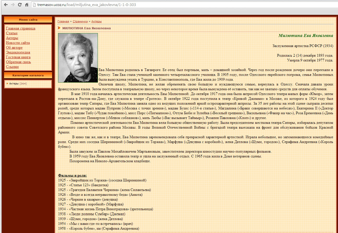 ![]() My Aunt, Yeva MilyutinaЕва Милютина I got this information concerning my mom's sister, my Aunt Yeva, by searching for her name in Russian, Ева Милютина, on the Internetnote. I was thrilled when I found this page in Russian (which I've captured in the screenshot, below). To see Google's translation, simply click on the below screenshot. (Clicking on it again will toggle it back to Russian.) The translation is adequate; though there are some obvious translation errors, it's readable and understandable. I can't speak to the content, though I assume it is accurate. The pictures of my Aunt Yeva I've been able to find look exactly like what I would've expected, somewhat like my own mother (who was 23 years younger than my Aunt Yeva). Compare my mom's picture here with the picture of Yeva in the below article. She also looks a lot like my mom's other sisters. (My mom had 6 sisters and one brother. Mom was the youngest.) This makes it very easy to identify her when she appears on screen in her movies. The biographical information, though quite sparse, is priceless to me. Her birthplace, Taganrog (Таганрог), is described in Wikipedia as Taganrog (Russian: Таганрог, IPA: [təɡɐnˈrok]) is a port city in Rostov Oblast, Russia, located on the north shore of the Taganrog Bay (Sea of Azov), several kilometers west of the mouth of the Don River. And the list of the various places she lived in is also quite interesting. (Here's a map of the Black Sea area with the cities mentioned in the below article circled.) The fact that she was married also piques my interest, especially as to whether she had any children, some possible first cousins in a world far, far away. The acronym in "Honored Artist of the RSFSR (1934)" in the article below stands for "Russian Soviet Federative Socialist Republic" which is what we formerly knew as the Soviet Union. Click on the article to toggle it between English and Russian. I also found a couple of other pages about my aunt. When viewing them in Google Chrome (and probably other browsers, too), you can have them translated into English: