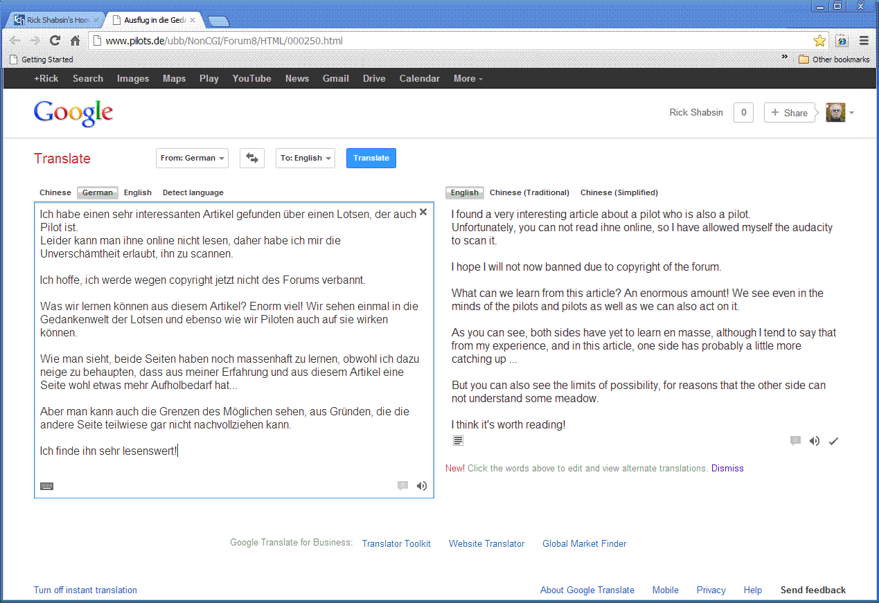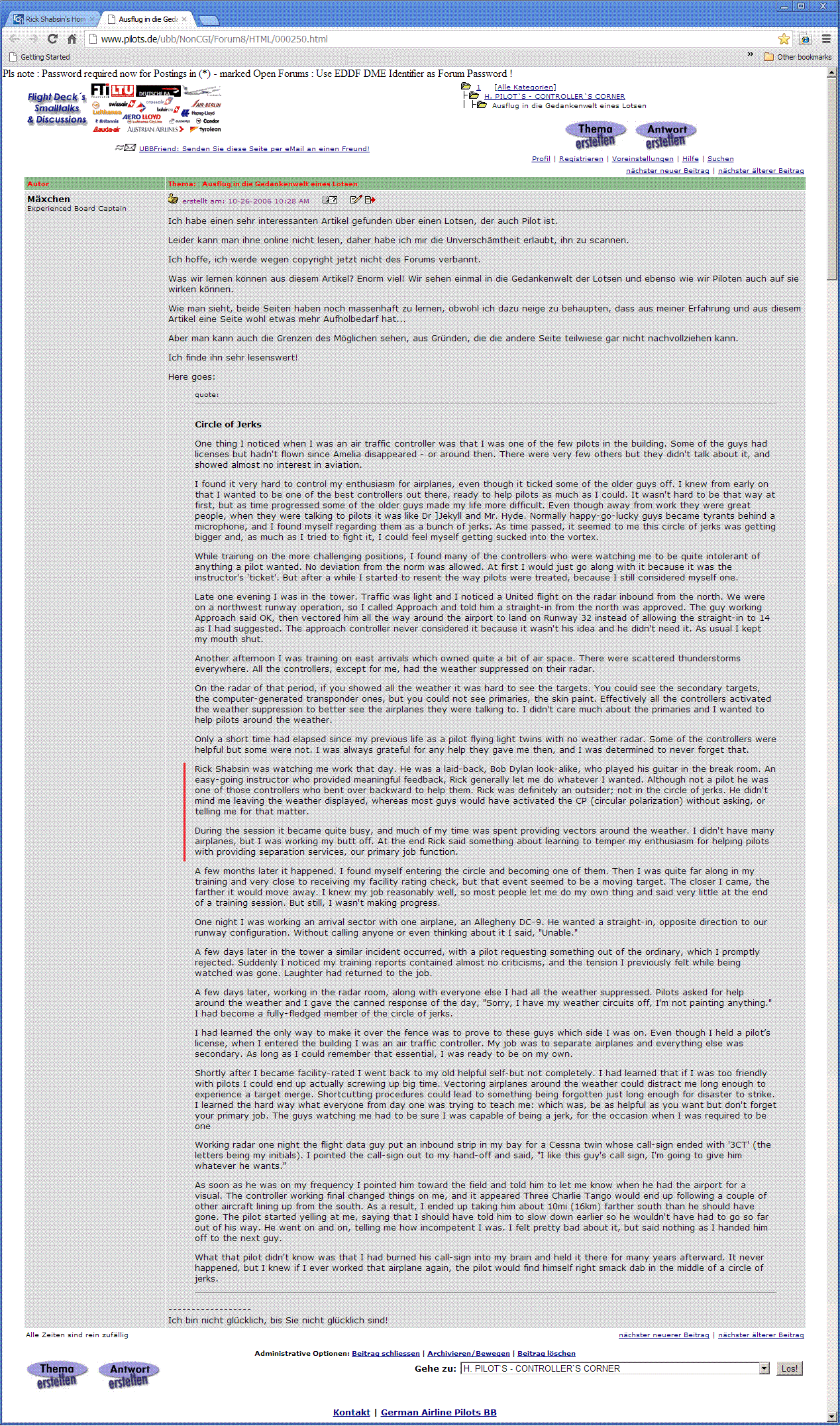 I'm pretty sure I know who the author of the Circle of Jerks article is; he gives himself away at the end when he reveals that his initials are C.T. And though I trained an awful lot of people during my years at Youngstown Municipal Airport (I know it was Youngstown due to the runway 14/32 reference), I remember C.T. was a pilot, and the writing style seems like it might've come from him. In regards to the "Bob Dylan look-alike" comment, well, I'm not sure where that came from (this? Not even close), though I did sing a lot of Bob Dylan songs in those days. Oh, well.... ![]() 1 The strike began on August 3, 1981. Read more about it on Wikipedia. 2 I did the Google search on my name on September 4, 2012. 3 I turned the article I found at http://www.pilots.de/ubb/NonCGI/Forum8/HTML/000250.html into a GIF to display here, just in case, at some point in the future, it disappears from the web. 4 I believe this article is from a discussion thread on a German airline pilot forum about the relationship between pilots and air traffic controllers. Of course, the Google Translate translations are not perfect.