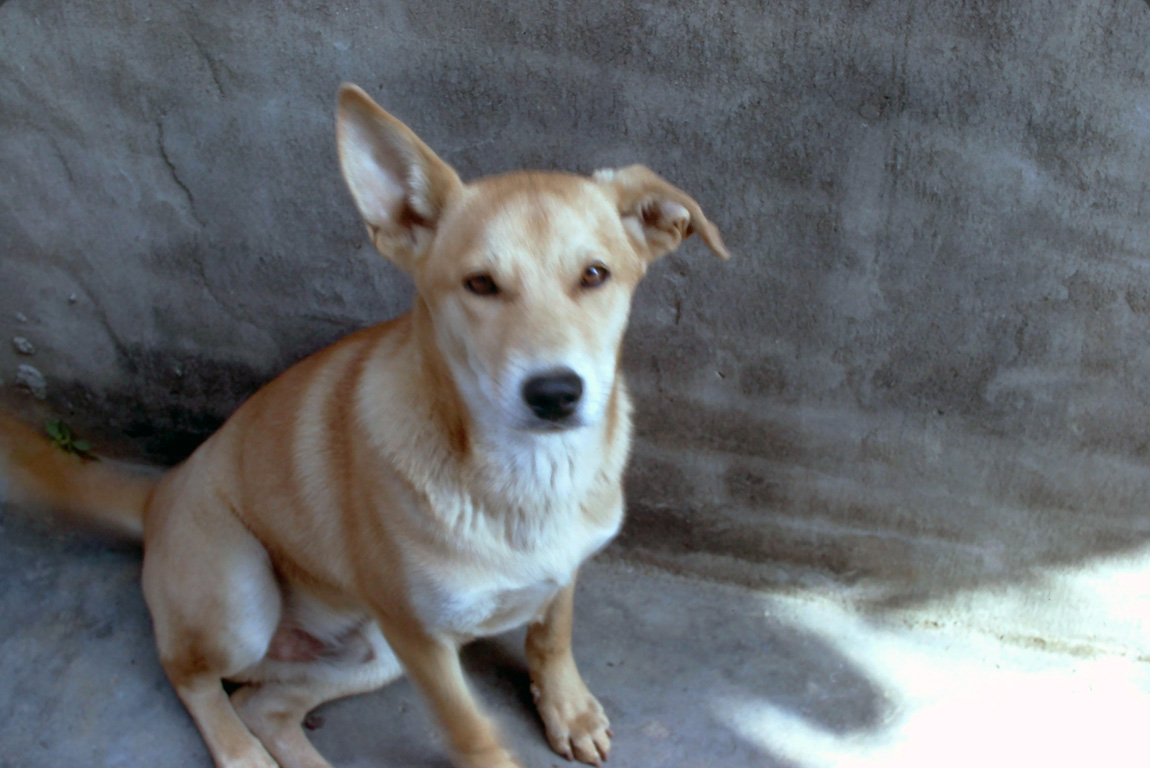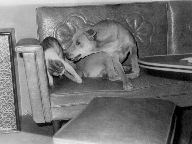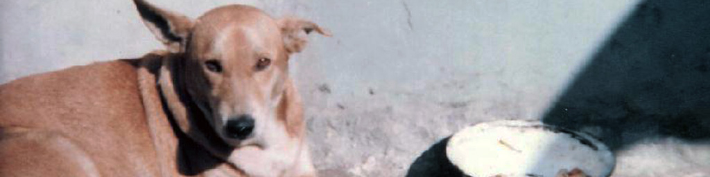 One day after a typhoon hit Taichung, we came home and noticed a little tiny black and white cat along side the road near where we parked our car. It couldn't have been more than a few weeks old (maybe just a few days old) and was soaking wet and lying very still, looking half dead. We took it home and cared for it and within a few days, we brought it back to life. As small and fragile as it was, we had to be pretty careful to keep Blue away from it, but we'd hold it up to the screen door for Blue to see and sniff. I think he was a little jealous at first, but after a while, as Tiger got older and bigger and stronger, we put the two of them together more and more, and they soon became good friends. They'd play together and we'd even find them sleeping together sometimes. This great friendship lasted for several years. After Mei-O and I left Taiwan, Blue and Tiger continued to live with Mei-O's family. One day, Tiger, who, like most cats was very free and independent, failed to come home. For several days there was no sign of him, and Blue (as Mei-O's sister Mei-Yu tells us) seemed very saddened, missing his friend a lot. Occasionally, Blue would sneak out of the yard and go off somewhere for a while (he wasn't allowed to run free outside very much, since free-running dogs were fair game for those who chose to catch them and eat them.) One day Mei-Yu followed him, and he led her to a bushy grove where Blue had been going to see Tiger's lifeless, now decaying body. Mei-O's mom came and recovered the body and buried it in a field near their house. They tell us Blue used to go there often and visit his old friend's grave. I can't verify this, since I never saw it happen, but that's what the family tells us, and I guess I've no reason to doubt it. DragonfliesThere are a lot of dragonflies in Taiwan, and Blue loved chasing them. He could actually jump quite high, straight up, nipping at them as they flew overhead, and he'd often catch one and eat it. While he was young and healthy, he never tired of chasing dragonflies. I suppose he built up some pretty good leg muscles, the way he could jump. He never chased anything else, just dragonflies. SuppertimeJust like Snoopy, when blue was hungry, he'd pick up his bowl in his mouth and stand by the screen door, waiting for someone to feed him. Sometimes, when he had to wait too long, he'd bang the bowl on the ground to let someone know it was feeding time. His diet, as with most dogs in Taiwan, was strictly leftover people-food, a mixture of rice, meat (usually beef, pork or chicken), fish, and vegetables, all left over from previous meals, all mixed together in a not-very-appetizing-to-people conglomeration, which he, being a dog and not a person, always seemed to love. His bowl was always licked clean. Blue's color (a light brown) turned out to be his curse. Dogs of his color were consider to be the tastiest, and we always had to be very careful to keep him in the yard. As he got older and wanted to 'sow his wild oats', Mei-O's mom found it very hard to keep him contained. She was so afraid he'd get out one day and end up on someone's dinner table that she had him castrated, so he wouldn't feel the need to run around the neighborhood looking for females. His castration really changed him. He got extremely lethargic and just laid around a lot and got really fat. But he also, and we don't know if this was related to the castration or not but it did occur at about the same time, developed a case of doggie-epilepsy. He would begin getting very nervous, pacing around frantically, then he'd fall down to the floor and have an epileptic-like fit, foaming at the mouth, banging his head and whole body noisily against the hard cement of the courtyard, and writhing in violent motion. This would occur at anytime, day or night, and pained us all to see him in such a state. Of course, we'd run to comfort him, and, especially when it was over, held and petted him to try to make him feel better. I remember those fits as one of the saddest things I've ever encountered, feeling so helpless watching my good friend suffer. I suppose here in the West, we would probably have put him down, but that wasn't an option for our family's pet in Taiwan. Everyone loved Blue so much, no one ever mentioned it. Hot Dog arrivesMei-yu tells us that later in Blue's life, their family got another dog. They named him Hot Dog, and he got along OK with Blue. The thing she remembers most is their feeding time. Each had his own bowl, and they were fed at the same time. But Blue always growled at Hot Dog and wouldn't let him eat until Blue was done, eating out of both bowls, yet always saving enough for Hot Dog. Blue was the elder, and he let Hot Dog know that that meant he was in charge. That seems pretty out of character for the Blue that I remember, so gentle and easy-going, but I suppose as he got older and sicker, he probably changed. But I still think of him the way I want to remember him, the way he was when I knew him, when he wouldn't hurt much more than a dragonfly. EpilogueBlue stayed with Mei-O's