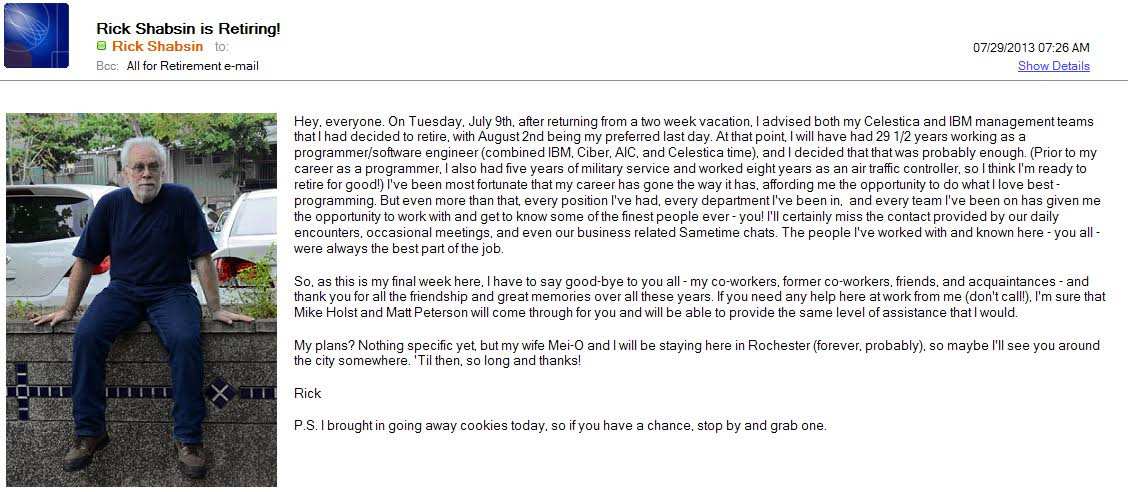 For eight years prior to August, 1981, I was an air traffic controller, having joined the FAA in 1973 after receiving my degree in Chinese Language and Literature from the University of Illinois in Champaign-Urbana. While working on my Masters degree, I fell ill and was hospitalized for over a week. I fell far behind in my classwork and, upon being released from the hospital, I decided not to return to school. While in the hospital, I had heard several radio and TV ads for openings in the air traffic control field and decided to give it a shot. I had loved being around airplanes all my life: growing up in Chicago, I often went out to O'Hare Airport to watch airplanes from the observation deck (back in the days when there was an observation deck), and later, I was an aircraft mechanic in the U.S. Air Force for five years. I thought air traffic control would be an exciting career choice. I was right. So from December, 1973 to August, 1981, I was an air traffic controller, and I loved it. In August of 1981, I was president of the Youngstown Air Traffic Control Tower's PATCO (Professional Air Traffic Controllers' Organization) union local when the union called for a strike and President Reagan fired us all. Without a job and with a family, I decided to go to school to pursue becoming a math teacher, something else I had always wanted to do. I enrolled at Youngstown State University and graduated in December, 1983 with a B.S. in Mathematics and a Computer Science minor. As I was about to begin my student teaching to get my Ohio teacher's certification, I was offered a job with IBM in Rochester, Minnesota, a job I just couldn't refuse. I first came to Rochester, Minnesota in January of 1984 and began my career as a software engineer in IBM Rochester's electronic circuit card manufacturing plant. For 16 years I designed, coded, debugged, and implemented many applications and software tools used in the card manufacturing process. Then, in March of 2000, IBM sold the entire circuit card manufacturing plant, including all of the people working there and supporting it, to Celestica, a Toronto-based electronics manufacturing services (EMS) company. I continued working for Celestica, doing much of the same kind of work as I did for IBM. Then, in February, 2003, Celestica announced it was shutting down the Rochester plant and moving all of the work overseas (surprise!) On July 18, 2003, after helping to move the work out and shut down the plant, I was able to officially retire from Celestica. (When we were sold to Celestica, our IBM seniority transferred with us, giving me more than 29 years seniority with Celestica even though I only worked for them for just a little more than three years.) But I wasn't ready to retire yet. I wanted to keep working, Fortunately, while working at Celestica, I kept in touch with many of my old, former IBM colleagues in the Card Test Development department, and when they found themselves needing a programmer to do some specialized work, work that I was well-suited for, I got the call. I was hired by CIBER, Inc., a company that supplied IBM with consultants and technical people with various skills. I spent over two years working for them as a software engineering consultant, mostly doing application development, and as a Field Manager, managing 9 or 10 other CIBER employees. I worked in basically the same area I started in at IBM in 1984, and even worked with many of the same people! Suddenly, in the middle of August of 2005, CIBER sold all of its consultants working at IBM (including me) to Analysts International Corp. (AIC), another consultant provider. Although working for a different company, I continued to write software for the Card Test Development team. Very little changed. Then after 2½ years with AIC, I was, quite surprisingly, offered a job with the Celestica team on-site at IBM Rochester. (When they shut down the main plant in 2003, about 12 people stayed behind to work inside IBM's walls under a special agreement with IBM. Over time, they grew substantially as they provided numerous contracted services to IBM until they eventually totally shut down in June of 2023.) So I went back to work for Celestica, still doing application development for the IBM Card Test Development team, only now as a contracted service provided by Celestica. Pretty weird! And finally, on August 2, 2013, after returning from an 11 day cruise through Northern Europe during which I made a major life-changing decision, I retired from Celestica! And I'm loving it! Here's the e-mail announcing my retirement which I sent out to the many people I worked with over the years at IBM and Celestica, at least, as many I could remember. A lot of years, a lot of people.... I am one of the fortunate. I had a job that I, for the most part, loved going to everyday, enjoying